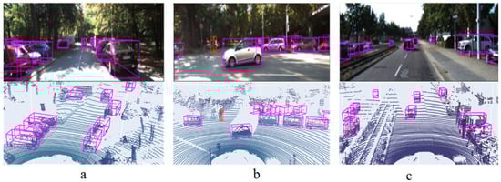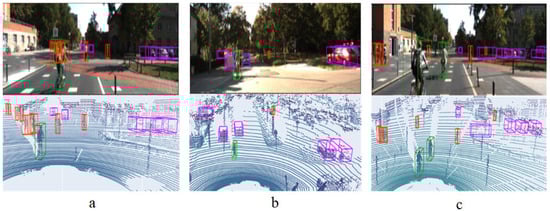 We conducted a detailed visualization analysis of the predictions of the Enhanced DetNet network on the test set, as shown in Figure 7, Figure 8 and Figure 9. These images, respectively, demonstrate the 3D detection effects of the model on the three major categories of “Car”, “Pedestrian”, and “Cyclist”. Through an in-depth analysis of these visualization images, we draw the following conclusions: