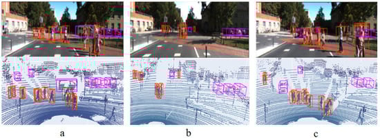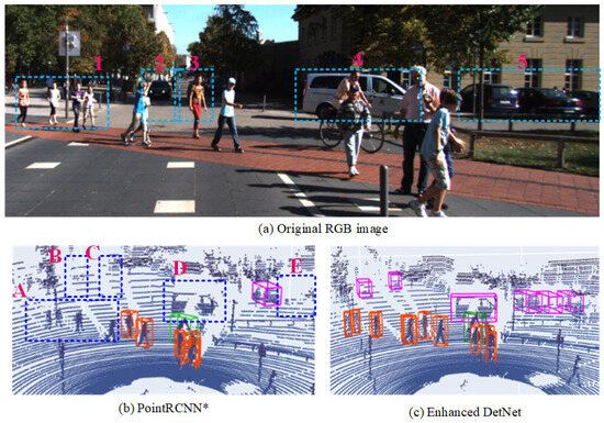 In Figure 8, the model can accurately and comprehensively identify targets in the scene. Taking Figure 8a as an example, it not only successfully detected targets at the “Easy” detection level but also did not miss any occluded pedestrians or heavily occluded cars. To conduct a detailed visualization and comparative analysis of the predictions of the Enhanced DetNet network on the test set, we have drawn Figure 11. Figure 11a shows the original RGB image, Figure 11b shows the predictions of the PointRCNN* network on the test set, and Figure 11c shows the predictions of the Enhanced DetNet network. In Figure 11a, the targets 1–5 marked with dashed lines are the targets that were not detected in Figure 11b labeled A–E. Notably, targets D and E are both occluded and difficult to detect, but they were successfully detected by the Enhanced DetNet network, which fully demonstrates the powerful detection performance of the Enhanced DetNet network.
