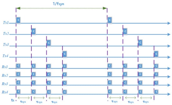 For multi-node networks, a time-division multiple access (TDMA) scheme [10] is employed, where each node repeatedly broadcasts a pulsed chirp signal, and the other nodes receive the signal in sequence. We took four UAVs as an example, as shown in Figure 1. Based on GPS timing technology [30], we first achieved coarse time synchronization at the nanosecond level. At time t, UAV 1 transmitted a signal of duration Tp, which was received by UAVs 2, 3, and 4. After a delay , UAV 2 transmitted the signal, which was received by UAVs 1, 3, and 4. Then, after , UAV 3 transmitted the signal, which was received by UAVs 1, 2, and 4. Finally, after another , UAV 4 transmitted the signal, which was received by UAV 1, 2, and 3. During the distributed SAR data acquisition time, these UAVs take turns broadcasting the synchronization signal repeatedly at the synchronization rate fsyn.