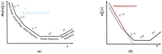 The general shape of the Allan variance. (a) The Modified Allan variance () of an oscillator. (b) The Allan variance () of the synchronization phase, which includes the inherent instability of the oscillator and the measurement error.
