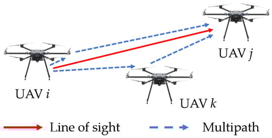 As shown in Figure 3, when UAV i emits a synchronization signal from its synchronization antenna, the signal takes several paths to reach the synchronization antenna of UAV j. One path is the line of sight (LOS), while another path involves scattering off UAV k before reaching UAV j. Additionally, the signal may scatter off structures like rotors before reaching UAV j, causing a fast-varying multipath channel.
