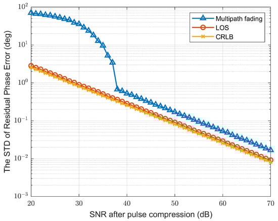 We conducted a simulation using MATLAB R2021b to illustrate the situation, and the parameters are shown in Table 1. Figure 4a shows the pulse compression waveform. It is evident that the pulse amplitude was reduced by 6 dB due to multipath fading compared to the LOS-only case. Additionally, the pulse was clearly split into two pulses of similar amplitude. We used the peak detection method to estimate synchronization errors under a post-pulse compression SNR of 30 dB. As shown in Figure 4b, there were significant wrong spikes in both the time and phase estimations. A Monte Carlo simulation was also conducted for different SNR levels, and the result is shown in Figure 5. The Cramer–Rao lower bound (CRLB) formulation is provided in the Appendix A (see Equation (A6)). When the SNR was below 37 dB, large deviations were caused by the wrong spikes. Once the SNR exceeded 38 dB, the wrong spike no longer occurred, but due to the degradation of the SNR by multipath fading, the accuracy remained worse than in the LOS-only case.