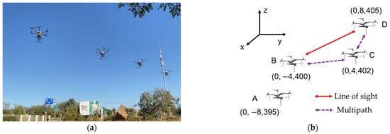 Four radar systems were mounted on four UAVs. The parameters of the radars and UAVs are shown in Table 2. Each UAV was equipped with a GPS-disciplined clock for coarse time and frequency synchronization. The flight formation is shown in Figure 6, with each UAV approximately 6 m apart from its neighbors, flying at an altitude of 300 m. To avoid blocking the LOS, the positions of the UAVs were deliberately offset from a straight line. Generally, during formation flight, the UAVs maintained relative stillness and did not have significant relative velocities. So, the direct wave path could be considered consistent. During flight, the rotation speed of the rotors ranged from 4100 to 4300 revolutions per minute (RPM), which induced a Doppler frequency shift that is negligible.