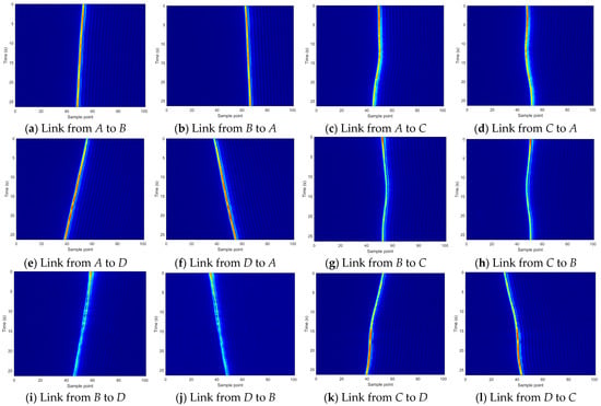 As shown in Figure 10, to visually demonstrate the reciprocity of the sync link, we up-sampled the matched filter outputs of the two-way link by a factor of 32, normalized each by its maximum amplitude, and plotted slices centered on the maximum. If the reciprocity is good, the waveforms from the dual one-way link will overlap. Namely, all the peaks should be aligned. In Figure 10a–d,f, the pulse signals basically coincide with each other and the reciprocity remains quite good. In Figure 10e, the maximum peaks are misaligned. The maximum value is at the first peak in the link from B to D (the blue line), while the maximum value is at the second peak in the link from D to B (the red line). The reciprocity is disrupted, and this leads to spikes in the synchronization phase.