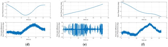 Unprocessed synchronization phase and first-order difference in all links. (a) Link AB; (b) Link AC; (c) Link AD; (d) Link BC; (e) Link BD; (f) Link CD.