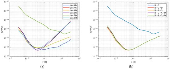 The Modified Allan variances (MVARs) of the synchronization phase for the different links. (a) The MVAR for all the 6 direct links; (b) the MVAR for Link BD from five different paths.