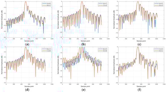 The 32-times-interpolated pulse compression signal slices from the synchronization links, normalized by each maximum value and centered on the maximum: (a) the link between UAVs A and B; (b) the link between UAVs A and C; (c) the link between UAVs A and D; (d) the link between UAVs B and C; (e) the link between UAVs B and D, where the maximum peaks are misaligned; (f) the link between UAVs C and D.
