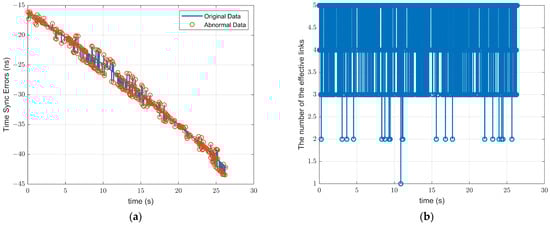 For Link BD, before Hampel filtering, the STD of FOD of the synchronization time was 0.28 ns. After Hampel filtering, the positions of the abnormal spikes were successfully detected in Figure 11a, and the STD of the FOD of the processed synchronization time was 0.09 ns. As illustrated in Figure 11b, we calculated the number of effective links using Equation (13), and . Although some minor jitters are also identified as anomalies after Hampel filtering, Link BD always maintains effective links, ensuring the calculation of the synchronization phase.