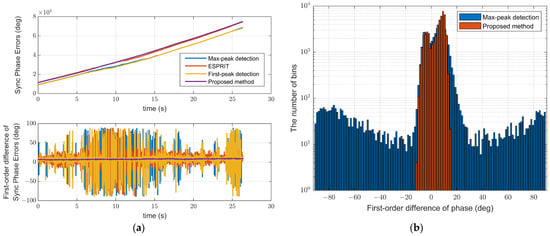 The performance of synchronization phase estimations. (a) The synchronization phase estimations and first-order differences (FODs). (b) A statistical histogram of the FODs of the synchronization phase using the max-peak position method and the proposed method.