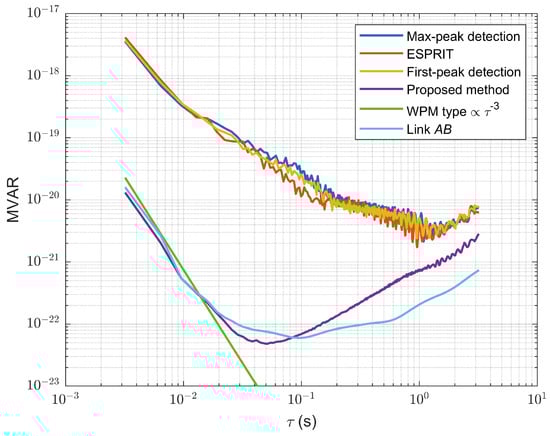 Next, we compared the MVAR of different methods for Link BD, as shown in Figure 13. After processing with the proposed method, the MVAR matches other links when τ < 0.1 s. This indicates that the short-term stability of the four disciplined oscillators is similar. Since the experimental system used the same batch of disciplined oscillators, the analysis is consistent with the system design expectations. In contrast, other methods show significant degradation in the minimum MVAR and corresponding τ values, as shown in Table 4. This degradation is due to errors introduced by the measurements. The phase jitter is distributed between −90° and 90°. Large phase jitter can cause phase unwrapping failure, while smaller phase jitter, although it does not cause incorrect unwrapping, can still increase the measurement STD and raise the MVAR. To comprehensively evaluate the overall improvement of these errors, we used the STD of the WPM noise in the synchronization measurements. The WPM type is proportional to in the MVAR measurements [36]. We note that for τ < 0.01 s, the MVAR of our method follows the trend. Therefore, we chose τ = 0.01 s and calculated the STD using Equation (6).