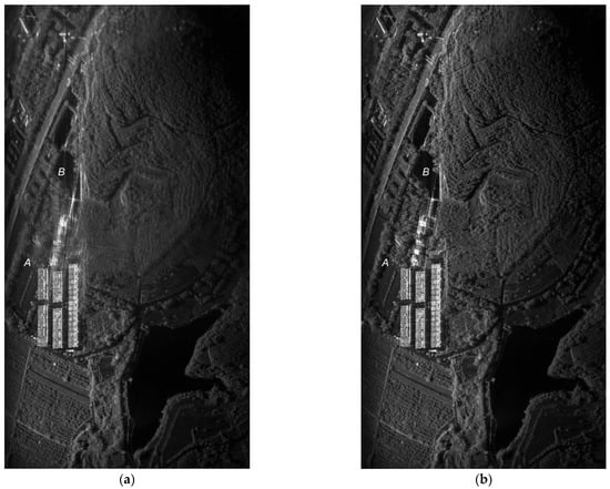 After compensation, we compared the bistatic SAR images before and after compensation. In Figure 14a, the upper half of the image is severely defocused, while the lower half is well-focused. This indicates that the multipath fading effects are not significant in the lower half of the image. Such defocused images can reduce the accuracy of image registration, which ultimately affects the precision of three-dimensional reconstruction. Our method successfully focused the entire SAR image, as shown in Figure 14b. We selected corner reflector A and scatter B for analysis to compare the improved performance of the proposed method. The corner reflector A and scatter B are indicated in Figure 14. Figure 15 shows the magnified SAR image containing a corner reflector (16× up-sampling) to better illustrate the details of the reflectors. The evaluation metrics of the corner reflectors are shown in Table 5. After processing, the impulse response width (IRW) of A and B are improved and the integral sidelobe ratio (ISLR) is reduced. The peak sidelobe ratio (PSLR) of A increases due to the focus of the corner reflector A.