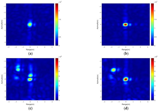 Magnified SAR image containing A and B (16× up-sampling): (a) corner reflector A compensated with unprocessed synchronization phase; (b) corner reflector A compensated with processed synchronization phase; (c) scatter B compensated with unprocessed synchronization phase; (d) scatter B compensated with processed synchronization phase.