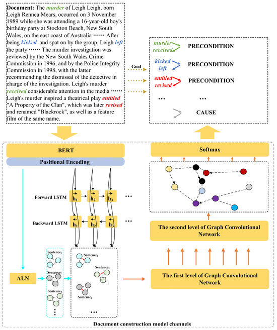 Traditional event causality extraction methods are mostly designed for extracting sentence-level causal relations [40]. As a result, they are unable to extract causal events across paragraphs and often compromise the integrity of the Event Causality Graph (ECG) by overlooking potential causal relations between events. To address this issue, we use the Association Link Network (ALN) in the event–event causal relation extraction channel to model the ECG for all input sentences. ALN is capable of processing triplet structures, (token1, relation, token2), extracted from the input text. Based on our research, these triplets are configured as causal triplet structures, (token1, CAUSE/PRECONDITION, token2). Finally, the modeled ECG is used as input to the dual-level GCN for model training.
