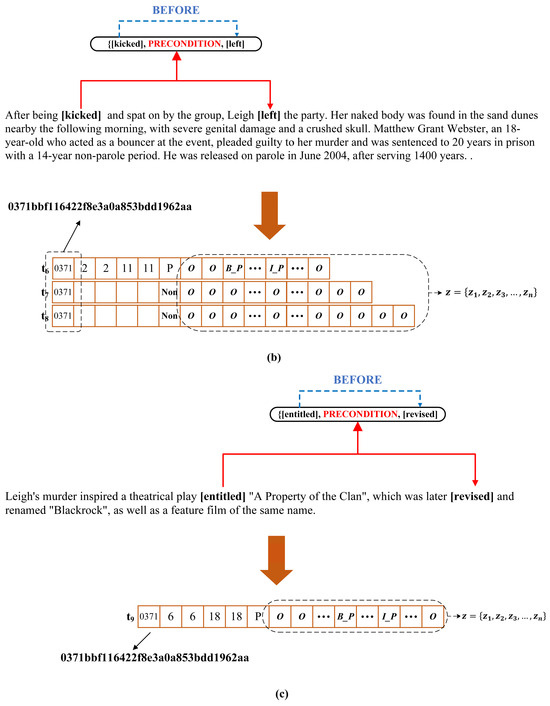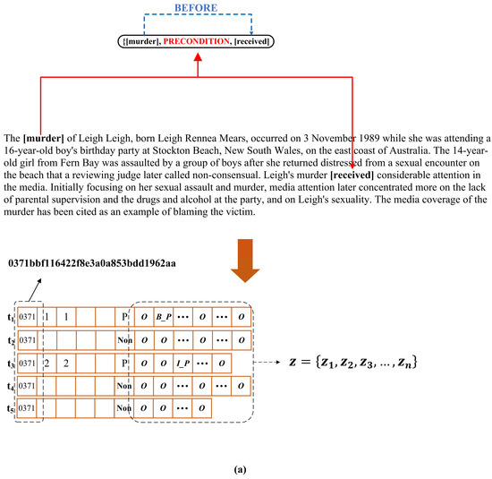 When extracting causal events involving temporal relations, we adopt a joint extraction approach. We define the sentences in the same document as . In ECRE, each token is assigned a causal label . The label “O” represents other event entities. CAUSE is defined as “the tail event is inevitable given the head event,” while PRECONDITION is defined as “the tail event would not have happened if the head event had not happened” [57]. The label “B_C” indicates the beginning of a CAUSE, and “I_C” represents the continuation of a CAUSE. Similarly, the label “B_P” marks the beginning of a PRECONDITION, while “I_P” represents the continuation of a PRECONDITION. Likewise, in event–event temporal relation extraction, each token is assigned a temporal label . The label “O” represents other entities, “B_BEFORE” indicates that the event occurred earlier, and “I_BEFORE” indicates that the event occurred later.