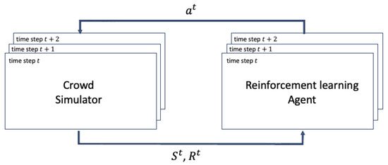 The scale of public events has expanded in recent years, partially due to the spread of social networking services (SNSs). This growth in scale has exacerbated the problem of congestion from large concentrations of people. Congestion causes pedestrian stagnation, prolonged overcrowding, and accidents, including some fatal accidents due to overcrowding. The key to solving these problems is human flow guidance. Research has been conducted on using deep learning to predict people flow [1], using data assimilation to reproduce pedestrian flow [2,3,4,5,6], and applying multi-modal machine learning for adaptive human interactions [7]. Research is also underway to apply artificial intelligence techniques, especially reinforcement learning [8] and simulation, to the study of people guidance with traffic lights [9,10]. These studies have been conducted against a background of the further development of simulation technology and the emergence of artificial intelligence that surpasses humans in games such as Go, Shogi, and chess [11,12]. Pedestrian guidance at the Mojiko Fireworks Festival [13] is currently conducted by incorporating the model predictive control framework [14] in control engineering. However, there has not been much research on using machine learning techniques such as reinforcement learning to guide pedestrian flow at events.