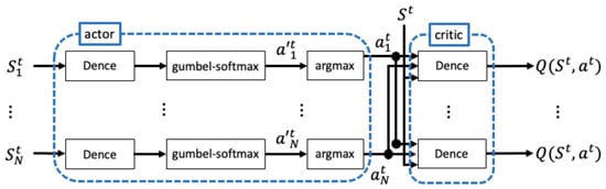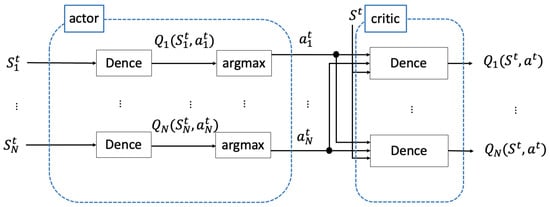 The actor–critic model structure used in our method. This is the same actor–critic structure used in MA-DDPG. However, it differs in that the actor outputs a Q-function for each action.