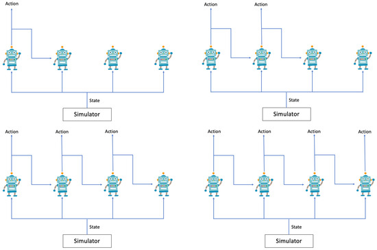 - Foerster, J.N.; Assael, Y.M.; Freitas, N.D.; Whiteson, S. Learning to Communicate with Deep Multi-Agent Reinforcement Learning. In Proceedings of the 30th International Conference on Neural Information Processing Systems, Barcelona, Spain, 5–10 December 2016; pp. 2145–2153. [Google Scholar]