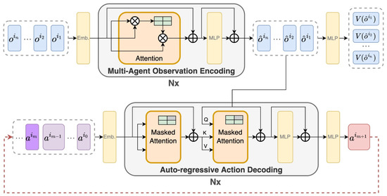 An overview of the decision-making process in MAT [21] is given in Figure 3. MAT considers each agent’s decisions as a sequence, and an agent decides its action based on the current observed state and the previously determined actions of other agents. This model incorporates the attention mechanism used for time series data to perform multi-agent reinforcement learning.