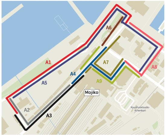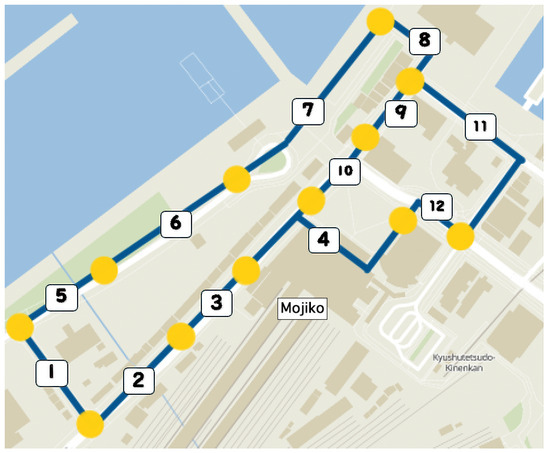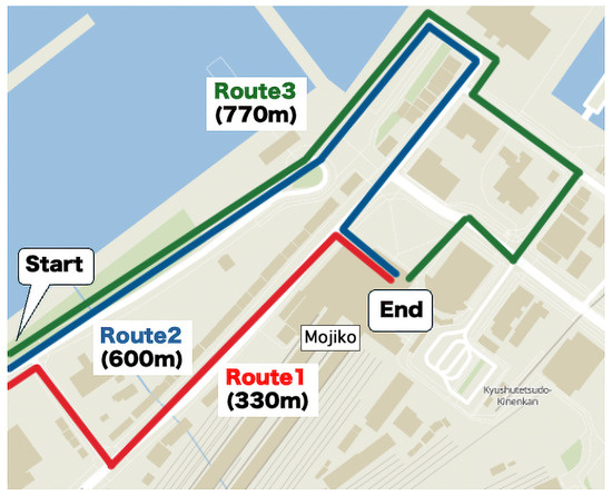 Topographic information of Mojiko, Fukuoka Prefecture. Pedestrians take one of three routes to the end point, and guidance is administered at nine locations.