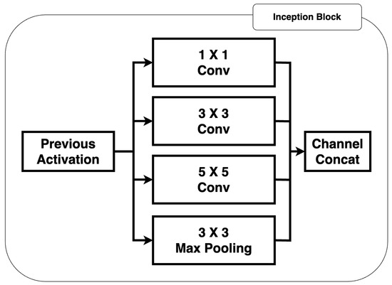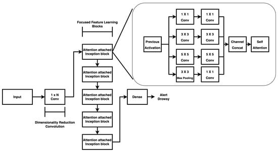 By applying self-attention, the model selectively amplifies critical EEG features related to drowsiness while suppressing irrelevant noise. This approach enhances robustness, particularly in handling EEG artifacts and inter-individual variations. The final attention-weighted features are passed through fully connected layers for classification. The last dense layer employs a softmax activation function to compute the probability of the EEG signal corresponding to ‘drowsy’ or ‘alert’ states. The Inception structure’s form was initially introduced in the GoogLeNet architecture [39] and is depicted in Figure 4.
