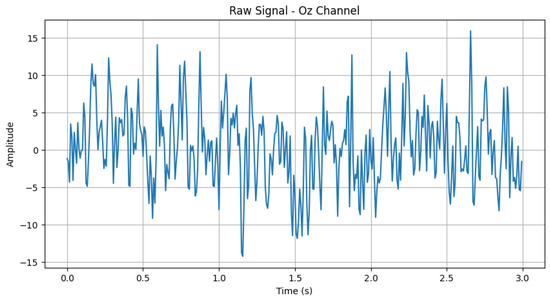 Our model utilizes data transformed through an STFT instead of raw EEG data. STFT is an effective technique for capturing the evolving characteristics of a signal through time–frequency analysis. This approach allows us to analyze the features of the original data across various time slices and frequency bands, improving the accuracy of drowsiness detection. Raw EEG signals are continuous time-series data, meaning they exhibit non-stationary behavior, where frequency components fluctuate over time. STFT is more suitable for analyzing non-stationary signals, such as continuously collected EEG data, because it allows the observation of frequency changes over time. Compared to the Fourier Transform, which only provides frequency components, STFT enables the analysis of how these components evolve over time. To effectively analyze these variations, the EEG signal was divided into fixed-length overlapping segments before applying STFT. The original EEG data, before applying STFT, corresponds to Figure 2.