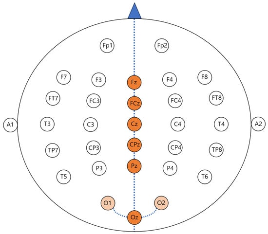 In this study, the thirty channels of the original dataset were grouped according to their attachment locations to measure the performance of sub-channel groups and, based on this, the six channels that demonstrated the highest performance were selected for evaluation. The electrodes are standardized according to the international 10–20 system when measuring an EEG with thirty-two electrodes. The name of each electrode is formed by combining alphabetical characters representing the attachment site and numbers indicating the left–right position. Specifically, ‘F’ signifies the frontal lobe, ‘T’ denotes the temporal lobe, ‘C’ represents the central lobe, ‘P’ corresponds to the parietal lobe, and ‘O’ designates the occipital lobe. These electrode placements are illustrated in Figure 5.
