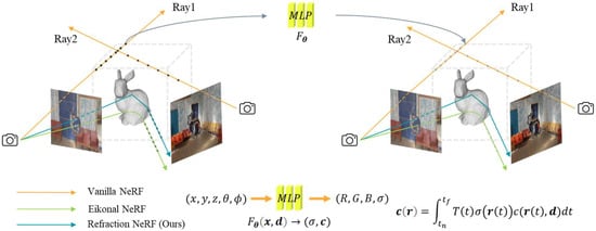 - Bemana, M.; Myszkowski, K.; Revall Frisvad, J.; Seidel, H.-P.; Ritschel, T. Eikonal Fields for Refractive Novel-View Synthesis. In Proceedings of the ACM SIGGRAPH 2022 Conference Proceedings, Vancouver, BC, Canada, 7–11 August 2022; pp. 1–9. [Google Scholar]