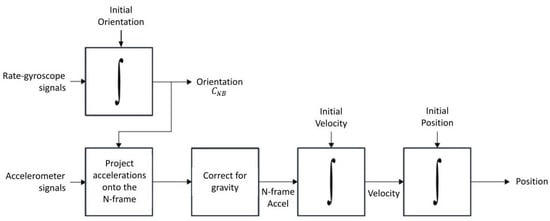 A navigation system based on the use of an IMU that is rigidly affixed to the mobile platform body (i.e., strapped down) is given in the block diagram of Figure 1. This diagram is indicative of the process for generating a navigation solution in the ideal case occurring when the input signals are error-free and initial conditions are known. This diagram illustrates that the solution is derived from the body angular rates and body linear acceleration time histories, which are expressed as three-dimensional vectors along the platform body axes entering from the left. These vector quantities undergo a series of integration processes to generate the navigation solution given the platform’s initial orientation, velocity, and position. In the absence of errors in the initial conditions and inputs, and assuming perfect integration, the navigation solution would be error-free. However, due to input errors, numerical integration errors, and uncertainties in the initial state, output errors inevitably occur.