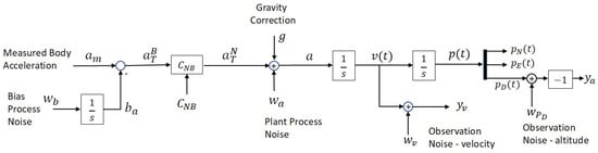 A block diagram of the strapdown navigation system model including the process and observation noise signals used in defining the navigation filter is shown in Figure 2. The process noises, and , represent the noise in the accelerometer data and the noise driving the bias model, respectively. The observation noises, and , are the noise signals in the velocity and altitude observations, respectively.