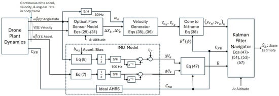 In robotics, localization refers to determining an object’s position and attitude in 2D or 3D space. This is a very important capability, especially in aerospace applications [1]. Using sensors, robots can maintain an estimate of their state, including velocity, attitude, and position [2]. Accelerometers within IMUs, which also include gyroscopes, are commonly used to calculate position by double integrating acceleration data [3]. However, IMU sensor readings inherently contain errors such as random noise and sensor bias, which degrade navigation performance [4]. Additionally, numerical integration introduces extra noise due to time discretization, exacerbating drift [5]. For instance, Euler integration results in local truncation errors, similar to those found in Taylor series approximations [6]. Thus, the double integration of accelerometer data to generate velocity and position leads to compounded drift errors [7], posing a significant challenge in autonomous UAV navigation. Recent experiments have shown the potential of fusing various sensors with IMUs to match the accuracy of IMU/GNSS systems [8]. This includes novel hardware combinations and algorithmic approaches to enhance sensor fusion accuracy in UAVs. Another approach in GPS-denied environments is the use of multiple UAVs, each with a range sensor and an IMU [9]. Drift is corrected by comparing distances from other UAVs in a swarm using trilateration. Cameras in UAVs can improve navigation through object recognition and tracking, utilizing landmarks. However, this approach is computationally demanding, and issues like unknown obstacles or lighting changes can cause data inaccuracies. To address these, SLAM (simultaneous localization and mapping) uses multiple cameras and LIDAR sensors to handle environmental lighting changes [10]. SLAM combines multiple sensors to generate a 3D map of the surroundings [11], offering accurate position estimation but at a high computational cost. Optical flow sensors are increasingly being explored for relative positioning. Effective in short-term stabilization, their applicability for long-term positioning is an area of active research [12]. Studies have indicated the potential of optical flow sensors in positional estimation, particularly when fused with other sensor syst- ems [13,14]. These advancements lay the foundation for the growing significance of optical flow sensors in UAV systems. The authors in [15] introduced a vision-aided approach to estimate the horizontal velocity of a UAV without accounting for biases. The current paper extends that work to estimate both the UAV velocity and accelerometer biases, employing an Extended Kalman Filter (EKF) to fuse data from an on-board IMU, an altitude sensor, and an optical flow sensor. This sensor integration greatly improves the accuracy of the EKF estimates for the UAV’s horizontal velocity, particularly during intermittent GPS signal loss. As a result, the system significantly reduces navigation errors compared to relying on dead reckoning alone. Our method uses pixel displacement measurements from the optical flow sensor to calculate horizontal velocity in the platform’s body frame. These measurements are then transformed into a North-East-Down (NED) locally level navigation frame, utilizing the platform’s attitude, which is derived from the IMU’s rate sensor, accelerometer, and magnetometer data. The resulting velocity measurements in the NED frame are used in the EKF to estimate both the UAV’s horizontal velocity and IMU accelerometer biases. To assess the effectiveness of this aided inertial navigation approach, we applied it to various simulated scenarios, including straight and circular trajectories. Estimation performance was evaluated by calculating errors in the estimated platform location and velocity. Our results demonstrate that the proposed approach reduces state estimation errors and improves UAV trajectory control during GPS signal outages. Section 2 presents the problem formulation. Section 3 describes the sensors that are involved, including a detailed development of the Optical Flow Sensor model. Section 4 describes the navigation filter. Section 5 describes the simulation model and the numerical parameters used in the generation of results. Section 6 contains the simulation results and discussion. Finally, Section 7 gives conclusions and future work.