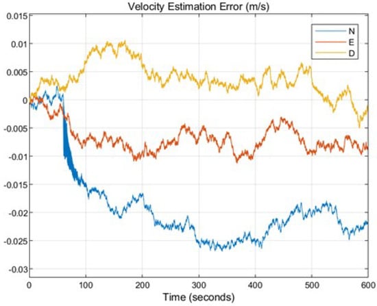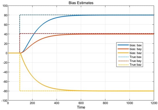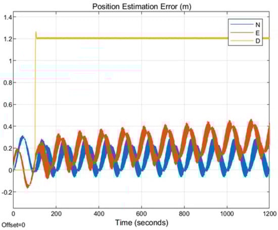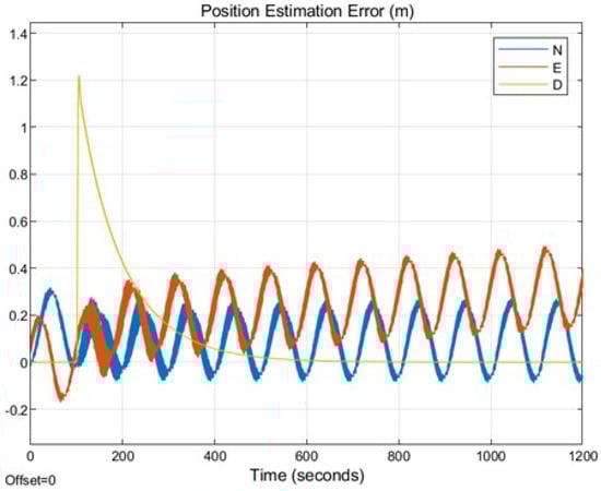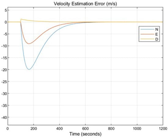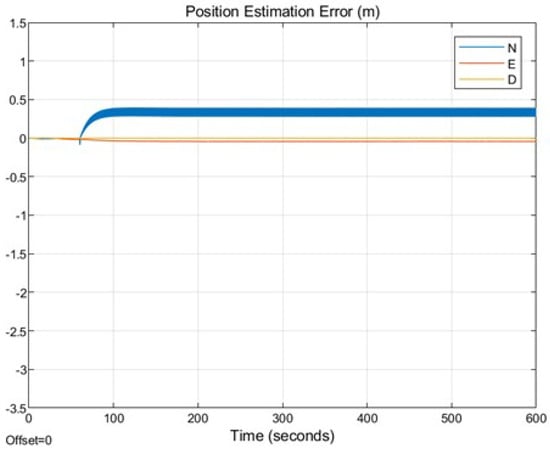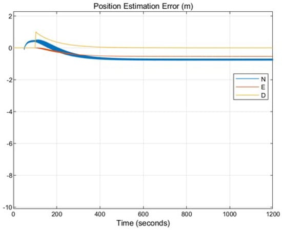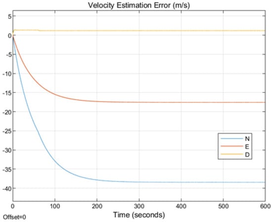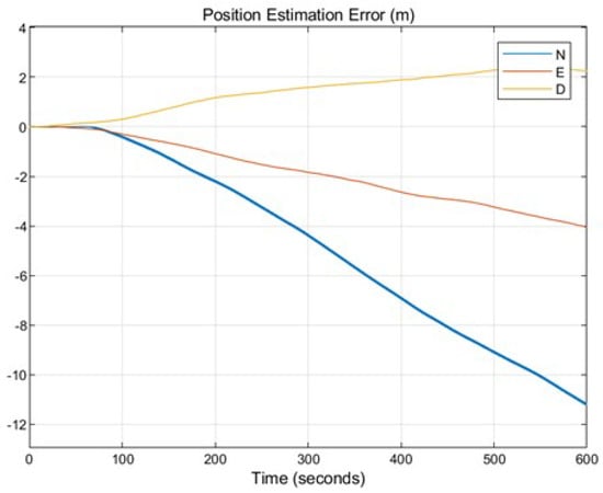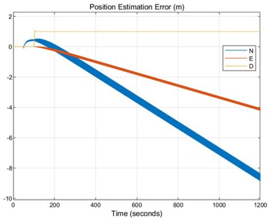 Biased sensor measurements were utilized, focusing only on estimating the UAV’s position and velocity without correcting for the bias. Over time, this led to the accumulation of position and velocity errors due to uncorrected sensor biases. The effects are illustrated in Figure 15 and Figure 16.