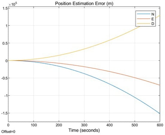 In this scheme, the accelerometer bias is turned on, and so accelerometer noise and bias error are present. The UAV’s position and velocity are estimated using a dead-reckoning approach; thus, filter corrections are not applied. As a result, sensor biases lead to significant drift in both the velocity and position estimates, causing large position errors over time. With bias present and no Kalman corrections applied, the dead reckoning solution becomes extremely large with position errors on the order of 150 km in 10 min. The performance of this approach is illustrated in Figure 6 and Figure 7.