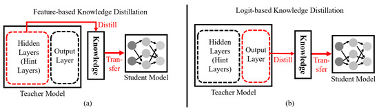 where X represents the training dataset, represents individual data points, and and represent the class probabilities predicted by the teacher and student models, respectively. Additionally, is the temperature parameter used to soften the class probabilities. The Kullback–Leibler (KL) divergence is used as the loss function to measure the difference between the softened outputs of the teacher and student models. By minimizing the KL divergence, the student model is trained to mimic the behavior of the teacher model, effectively absorbing the teacher’s “Dark Knowledge” and enhancing its own classification performance. Knowledge distillation can be implemented in two main ways: using logit-based and feature-based approaches. In Figure 2, we show the differences between these two knowledge distillation approaches.