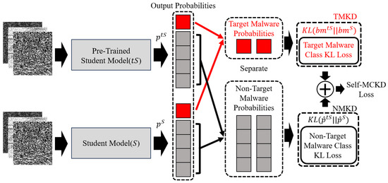 Different from the loss function in traditional knowledge distillation, which aims to simply reduce the overall difference in the probabilities between the teacher and student models, Self-MCKD aims to reduce the difference for both the target and non-target malware classes separately between the teacher and student models. Also, since Self-MCKD replaces the large and deep teacher model with a pre-trained small and shallow student model, can be replaced with . Finally, considering that equals , we can reformulate Equation (5) as follows: