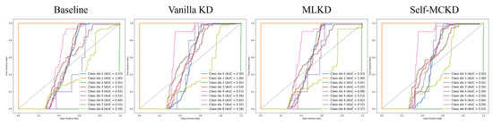 In Figure 4, we show the ROC curves along with the AUC scores for each method on the MMCC dataset. As shown for class index 8 (e.g., Gatak), indicated by the light green line in Figure 4, Self-MCKD outperformed the other methods, achieving an AUC score exceeding 0.4. In Figure 5, we also visualize the T-SNE results for each method on the Malimg dataset. Compared to the baseline and the other knowledge distillation methods, Self-MCKD produced more distinct and well-separated representations.