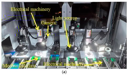 The overall appearance of the bearing surface defect detection device mainly includes a touch screen, an LED display screen, signal lights, and various buttons, as shown in Figure 1. The touch screen primarily shows the PLC control and monitors the overall operation of the machine; the LED display screen mainly shows the software interface operation, as well as the status of cameras at each station and their detection results; the buttons are mainly used to control the overall operation of the machine: the black button switches between manual and automatic modes, the green button is used for device initialization and startup, and the red button is used for device reset and emergency stop. Internally, the bearing defect detection device consists mainly of cameras, light sources, mechanical claw, and electrical machinery. Through PLC and sensor control, it triggers the industrial camera to take pictures, switches the light source, operates the electrical machinery, and controls the mechanical claw for gripping, thereby performing defect detection on the bearings and sorting them into qualified and unqualified categories.