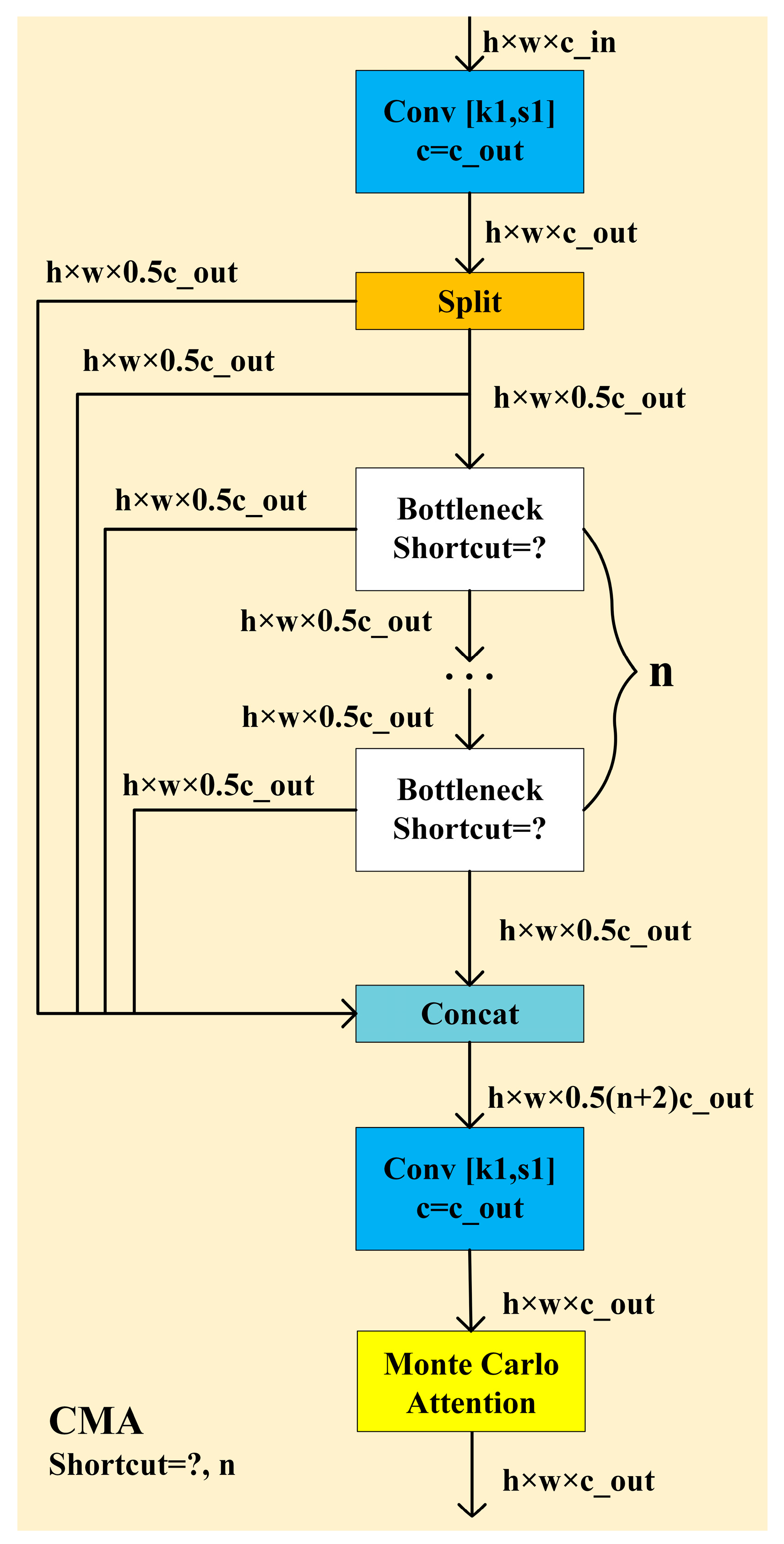 We introduce a novel CMA module, shown in Figure 8, which builds on the C2f module and combines the Monte Carlo Attention (MCA) mechanism to improve feature representation. Specifically, the C2f module improves the diversity and richness of feature extraction by integrating information from multiple scales. The Monte Carlo Attention mechanism optimizes attention allocation by performing random sampling on the feature map. Using Monte Carlo methods, it automatically captures key spatial and channel information, enhancing the model’s focus on important regions. Embedding the Monte Carlo Attention (MCA) into the C2f module significantly improves the network’s ability to model complex image features. This is particularly useful for visual tasks with high noise or background interference, as the MCA module enables more precise focus on valuable regions. Overall, this approach enhances feature richness and improves the model’s accuracy and robustness across various tasks.
