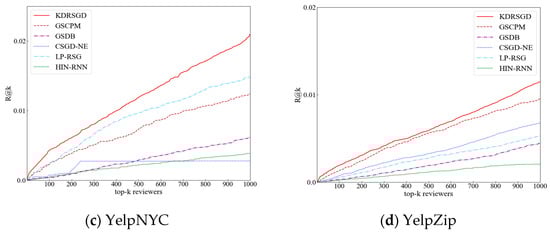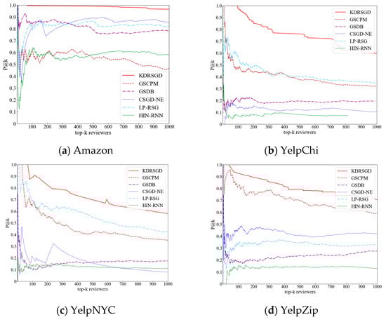 - HIN-RNN and CSGD-NE have poor P@k and R@k on four datasets, e.g., their P@k values remain around 0 and 0.1042—among the top-1000—on YelpChi and around 0.1283 and 0.4218—among thetop-1000—on YelpZip, respectively. CSGD-NE and HIN-RNN’s R@k reach around 0 and 0.0136—among the top-1000—on YelpChi and around 0.0028 and 0.0039—among the top-1000—on YelpNYC, respectively. The main reason is that CSGD-NE uses the indicator weighting strategy to detect review spammer groups and HIN-RNN is unable to accurately mine the collusive user relationships on the sparse datasets, resulting in poor detection effect.