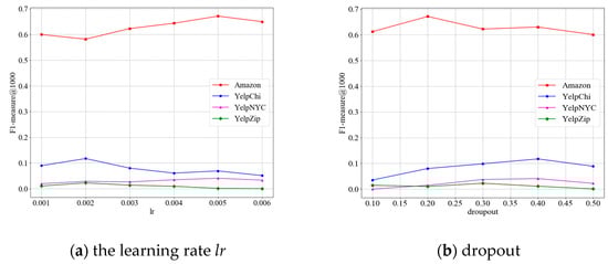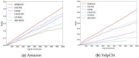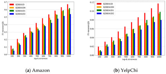 - KDRSGD’s detection performance exceeds the performance of KDRSGD1 and KDRSGD2. Compared to KDRSGD1, KDRSGD’s F1-measure@1000 is improved by 8.29% and 19.25% on two datasets, respectively. This is because KDRSGD uses a knowledge distillation model to fully learn discriminative candidate group vectors, which help detect the collusive spammers accurately. Compared to KDRSGD2, KDRSGD’s F1-measure@1000 is improved by 24.39% and 46.56% on two datasets, respectively. This indicates that the use of similarity masking in KDRSGD helps reduce the noise and irrelevant feature information, which improves the detection performance of KDRSGD.
