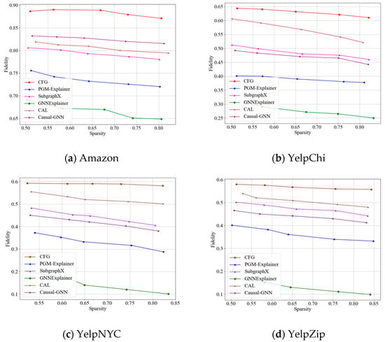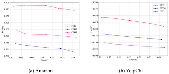 - CFG’s Fidelity is greater than that of CFG0 with diverse Sparsity on two datasets. The improvements of the Fidelity of CFG over CFG0 are around 21% on Amazon and 10% on YelpChi, respectively. This is because CFG uses a generative adversarial network as a counterfactual generation model, which can fully explore the causal relationships between candidate groups and detection results to obtain the counterfactual groups in accurately explaining the detection results.