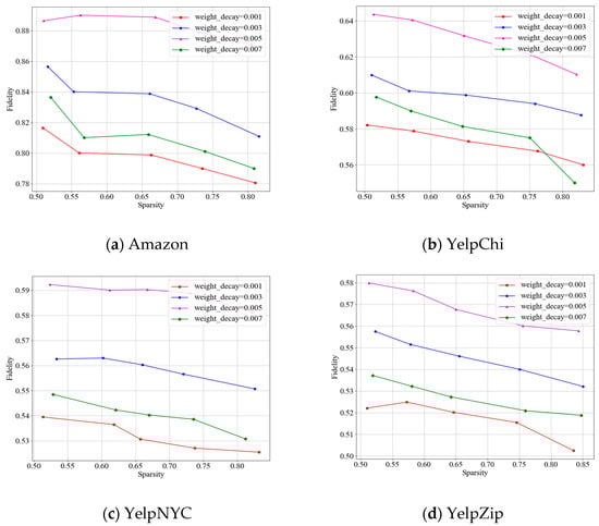 - Graph neural network-based methods (i.e., PGM-Explainer, SubgraphX, and GNNExplainer) display various changing trends of Fidelity with diverse Sparsity on the four datasets. SubgraphX’s Fidelity is 6%, 9%, 11%, and 10% greater than that of PGM-Explainer with diverse Sparsity on the four datasets, respectively. This shows that mining subgraphs to search the relational local topological structures of predictions is effective for interpreting the prediction results. The Fidelity of PGM-Explainer is 7%, 12%, 19%, and 23% greater than that of GNNExplainer with diverse Sparsity on the four datasets, respectively. The reason is that PGM-Explainer uses a probabilistic graphical model to obtain the accurate interpretations. GNNExplainer has poorer interpretation performance compared with PGM-Explainer and SubgraphX. The reason is that GNNExplainer ignores the interpretation of the detection results from a global structure and loses important node information.