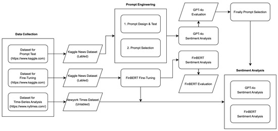 In this study, sentiment analysis (SA) was conducted on categorized news data using GPT-4o and FinBERT. To establish the fine-tuning process, prompt design, and experimental datasets, news data were obtained from Kaggle and supplemented with additional data collected through dynamic crawling from The New York Times. Subsequently, SA was performed using GPT-4o and FinBERT by leveraging headlines, descriptions, and sectors from the labeled news data in Kaggle. To further enhance the performance of FinBERT and GPT-4o in SA, fine-tuning and prompt engineering techniques were applied, respectively. We sampled five data points for each sector, selected the two best-performing prompts, and then generated four additional derivative prompts, resulting in a total of six prompts from the prompts’ design step. We utilized a confusion matrix as the performance evaluation metric and found that, across all sectors, the performance of GPT-4o with the optimized prompt design outperformed the fine-tuned FinBERT model.
