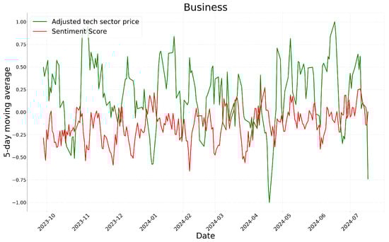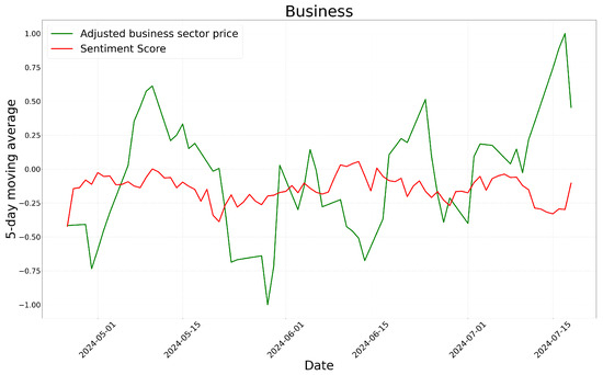 The analysis of the graph indicates that, except for the business sector with a relatively short period of time, most sectors exhibit similar patterns in sentiment scores and stock price movements. In particular, there are multiple instances where an increase in sentiment scores corresponds to an increase in stock prices, and a decrease in sentiment scores coincides with a decline in stock prices. These findings suggest that sentiment analysis results may be correlated with stock market movements to some extent.