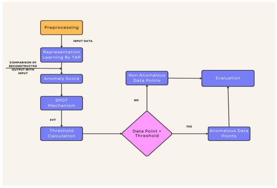 For efficient anomaly identification in multivariate time series data, we integrate the Streaming Peaks-Over-Threshold (SPOT) mechanism with the transformer-based Adversarial Perturbations (TAP) model in our suggested methodology as shown in Figure 1. To improve the robustness and accuracy of anomaly identification systems, this novel strategy combines cutting-edge machine learning techniques with real-time anomaly detection approaches. We’ve listed the main steps in our process below: