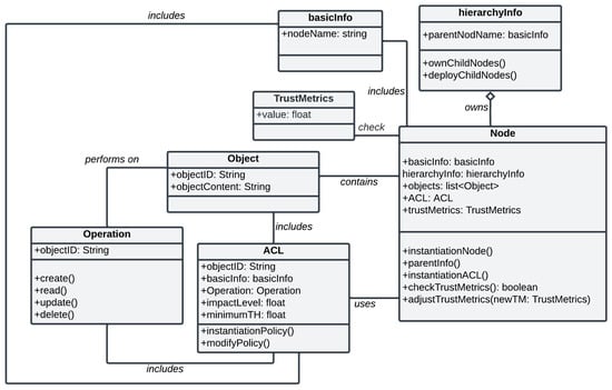 A node encompasses a range of critical functionalities that enable its role within the blockchain infrastructure as shown in Figure 1. It can set up and manage ACLs for its own objects by creating new policies or updating existing ones, ensuring that access rules follow organizational requirements. The node also updates its TM based on feedback from other nodes about its actions and behavior, reflecting changes in its trustworthiness. Additionally, the node handles operations on its objects, such as create, read, update, and delete (CRUD), according to decisions made by the access control mechanism. This ensures that policies are consistently applied across the network. Beyond access control and policy enforcement, the node supports key blockchain operations, including creating blocks, processing transactions, and maintaining the ledger. These functions work together to keep the blockchain network decentralized, secure, and tamper-resistant.
