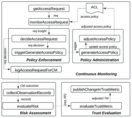Risk assessment leverages data from continuous monitoring to evaluate the risk associated with each access request. This process considers factors such as the sensitivity of the requested resource, the requester’s historical behavior, and the current access context, assigning an RF to each request. The RF plays a key role in decision-making, enabling proactive responses to potential threats. Trust evaluation, on the other hand, assesses the trustworthiness of the requester by analyzing behavioral consistency, adherence to security policies, and alignment with expected access patterns—insights drawn from continuous monitoring. This evaluation produces a trust metric (TM), reflecting the requester’s reliability within the given access context.