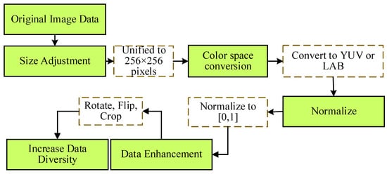 Next, pixel values of the images were normalized to the range [0, 1] to improve the stability of model training. Normalization facilitated faster convergence of the model. Finally, data diversity was increased through operations such as rotation, flipping, and cropping to prevent overfitting. Data augmentation enhanced the model’s generalization capability, enabling it to perform well across various scenarios.