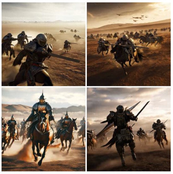 The visual clarity and coherence of the images in Figure 5, Figure 6 and Figure 7 suggest more than just technical prowess—the images resonate with refined detail and exhibit a seamless balance between elements. The model’s ability to synthesize both macro and micro aspects of each scene becomes especially apparent in these examples. Take the “castle in a fantasy world” scene, for instance: the imposing fortress rises atop a mountain, exuding grandeur. The dense forests encircling the base and the ethereal clouds floating above are depicted with such precision that the realism seems to seep through each pixel. This heightened fidelity, particularly in compositional balance and intricate detailing, owes much to the cross-modal attention mechanism, which sifts through the textual narrative, extracting and infusing it into the image creation process. Moreover, the model proves adept at producing a broad spectrum of images across genres and settings, a testament to its versatility. Whether constructing dreamlike fantasy worlds or meticulously detailed urban nightscapes, the generated visuals consistently exhibit richness and variety. The model exhibits exceptional performance in capturing scene element accuracy, reliably reproducing details and key elements across diverse artistic styles. In the “ancient battlefield” scene, for instance, the warriors’ fierce combat across a vast plain, with galloping horses in the distance, vividly conveys the dynamic nature and depth of the scene, infusing the image with vitality. This precision, from sweeping grandeur to intricate detail, instills a sense of realism and vividness into each generated frame.
