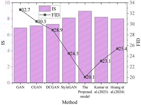 As depicted in Figure 8, the proposed model surpassed traditional methods like GAN, CGAN, DCGAN, and StyleGAN in both the Inception Score (IS) and Fréchet Inception Distance (FID) metrics, also exhibiting clear advantages over recent methods in the literature [34,35]. Specifically, the method in [34] achieved an IS of 8.2 and an FID of 23.1, while the approach in [35] attained an IS of 8.0 and an FID of 25.4. Although these methods demonstrated considerable performance in terms of image generation quality and diversity, the proposed model outperformed them.