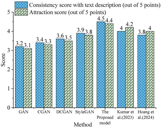 As illustrated in Figure 9, the proposed model exhibited notable superiority over traditional models, such as GAN, CGAN, DCGAN, and StyleGAN, in both text description consistency and visual appeal scores, also surpassing the methods from the literature [34,35]. Specifically, the method outlined in study [34] achieved a consistency score of 4.0 and an appeal score of 4.2, while the approach in study [35] resulted in a consistency score of 3.8 and an appeal score of 4.0. Although these models demonstrated strong visual appeal, a distinct gap was observed when compared to the proposed model.